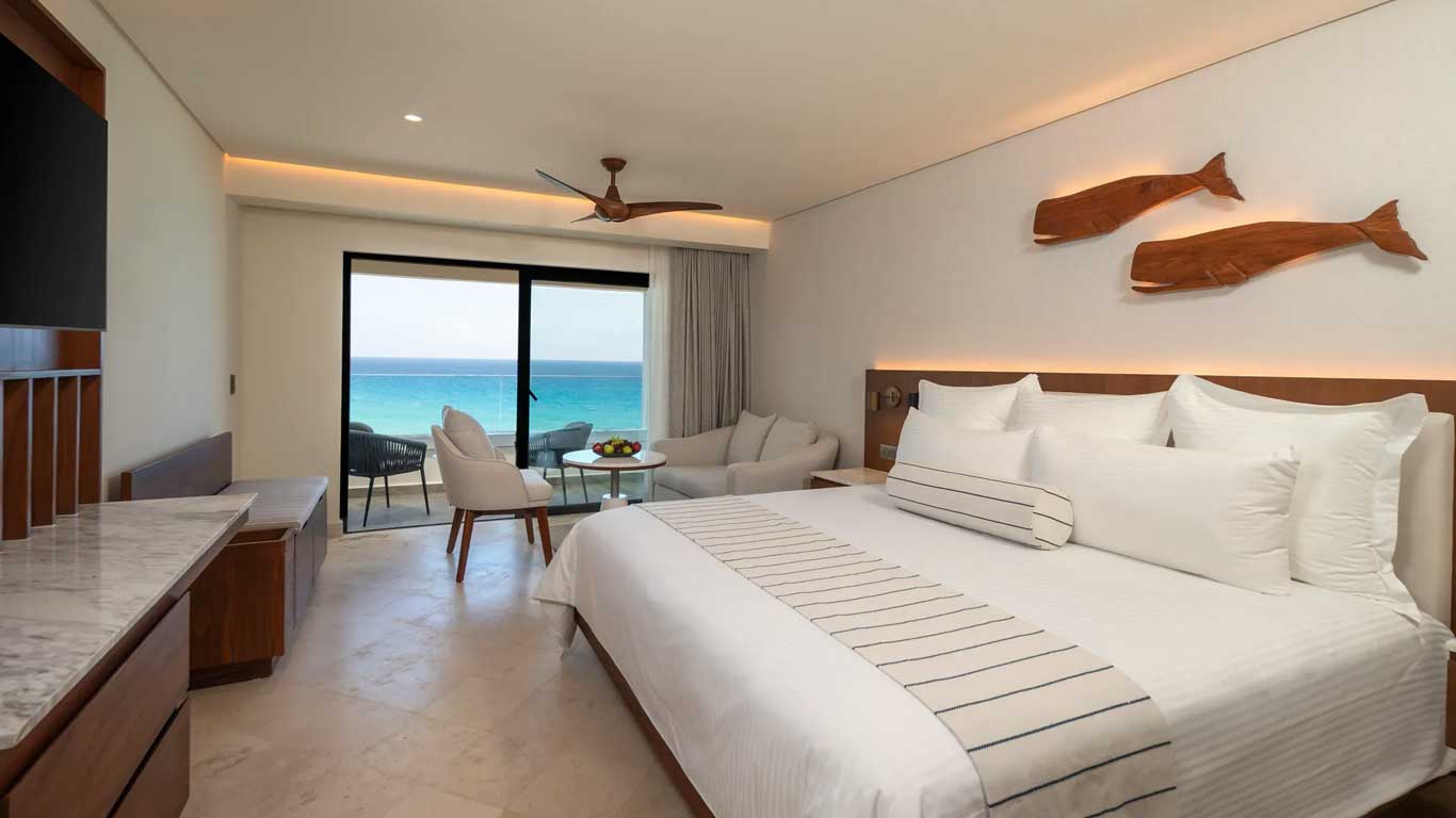 The Deluxe Tropical View Balcony at Mirabel Cancun room offers 415 square feet of modern comfort and elegance, featuring your choice of one king-size bed or two queen beds. Enjoy serene views of the tranquil Nichupté Lagoon from your private balcony, and unwind in a cozy seating area designed for relaxation. The room includes a full bathroom with a walk-in shower and accommodates up to two guests—perfect for couples seeking a peaceful retreat.